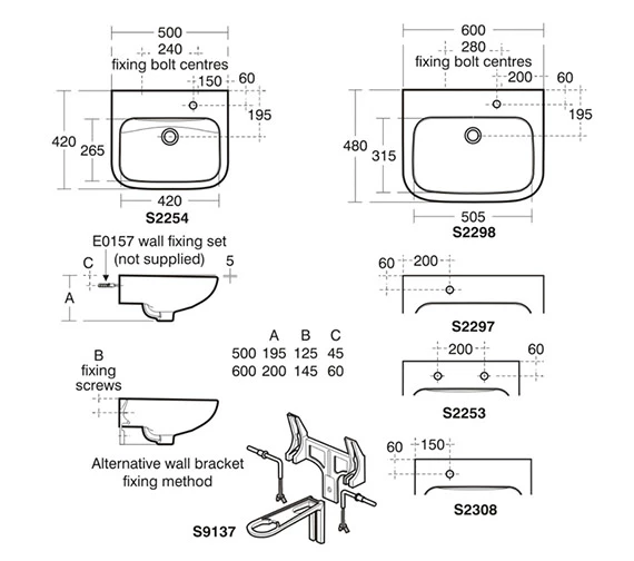 - Washbasin wall mounted using E015767 wall fixing set, or panel mounted using E006267 fixing set.
