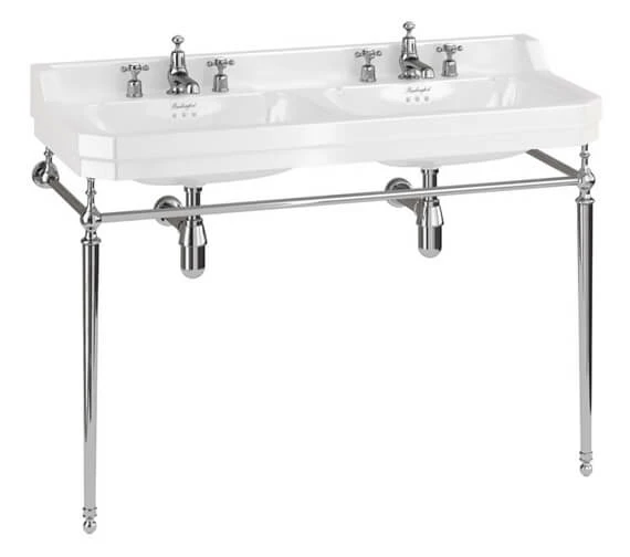 Effortless elegance is what sets this Burlington Edwardian 1210mm Double Basin With Washstand apart from others. The basin, supplied with different tap holes, looks stunning in a white finish. Basin is crafted from excellent quality fine fire clay materials, high in strength and durability. The Washstand is made from brass and enjoys a lifetime guarantee from the manufacturer. The unit has a width of 1210mm and a depth of 510mm. The two legs are held securely in place by two floor-mounted nozzles.