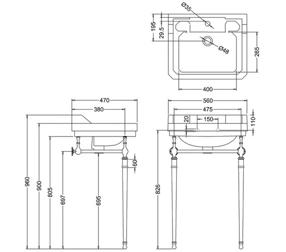 The stand is manufactured from brass and gives a stunning look. The vitreous china basin measures 560mm wide and 470mm deep. With Burlingtons lifetime guarantee and QS Supplies discounted rate, you will be pleased you invested in such a premium quality piece.