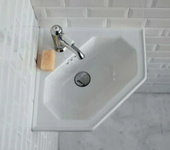 - Corner wall-mounted cloakroom basin.