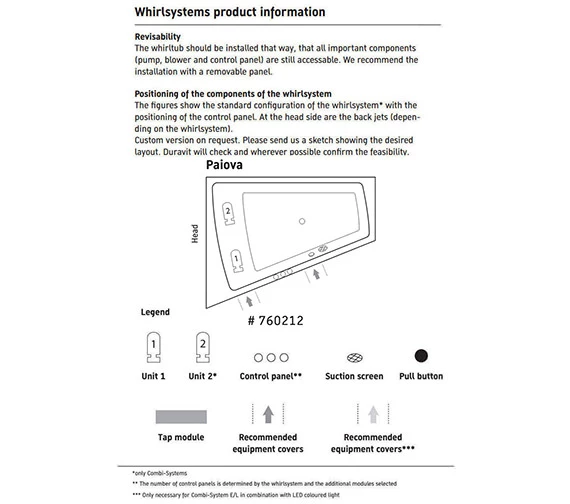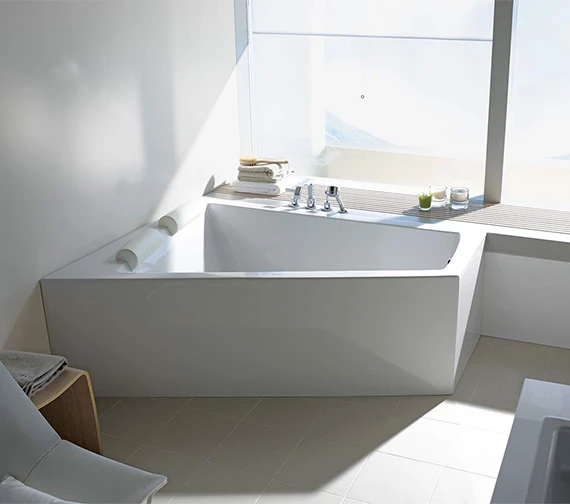 Looking for an unusual bath to match a corner, with a panache and functional features to match? It will help if you look no further than this model from Duravit Paiova. This double-ended and beautifully designed by EOOS, it has a gleaming white Alpine colour and is made from quality 5mm sanitary acrylic. The bath is available with either a right or left backrest slope, and you can choose a whirlpool system from Jet, Combi E or Combi L to match your needs. This system is complete with waste and overflow and has an easily operable control panel. There are multiple jets for a great pressure experience, and you can further enhance it by opting for a sound system (extra cost).
