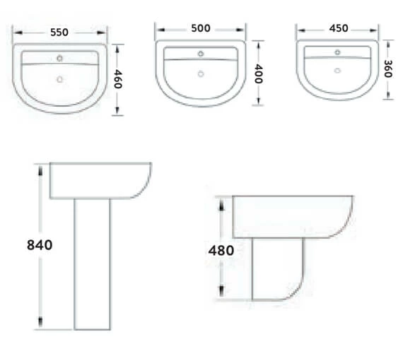 - 550mm Basin With Full Pedestal: 550mm W x 840mm H x 460mm D.