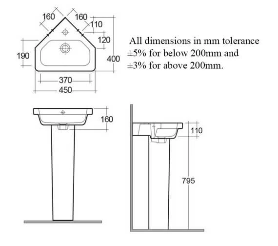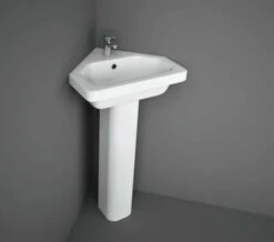 RAK Resort 450mm Wide 1 Tap Hole Corner Basin And Full Pedestal has a smooth, conical format with an exquisite look and comes with a superb white finish. A pleasing melange of smooth contours and gently scooped interior; it exudes a solid sense of style. Designed to perfection, it is supplied with a full pedestal and pre-drilled single tap hole and overflow hole. Made from durable vitreous china material, it is backed by a 25-year guarantee from the manufacturer.