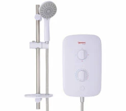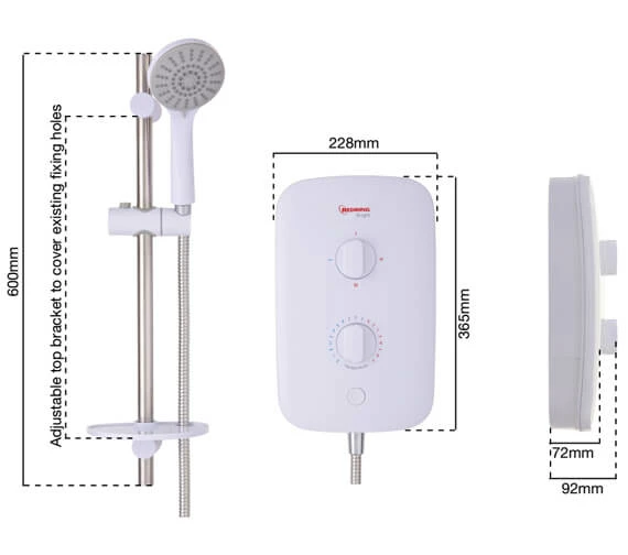 Control your showering experience and get joyful results with the Redring Bright 7.5kW Multi Connection Electric Shower. The electric shower allows for precise temperature control and instantaneous hot water to ensure the most comfortable and customised shower possible. The water flows from the included shower head in one of three modes that you choose. It doubles as a handset as the showerhead is attached to an anti-kink 1.25-meter shower hose. The electric box unit measures 228 millimetres in width by 92 millimetres in depth by 365 millimetres in height.