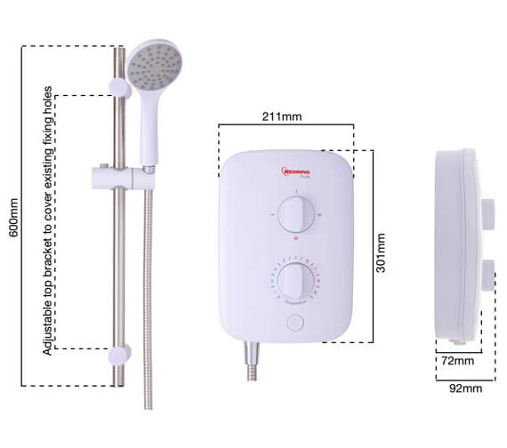 Add sheer simplicity to any shower space both modern and traditional with the Redring Pure 7.5kW Instantaneous Electric Shower. The electric shower kit ensures ease of use both when turning it on and when adjusting the temperature of the water with excellent precision. It enables instant water heating and comes out of the single-mode showerhead with the perfect level of pressure. It sits on a 600-millimetre-tall shower riser, while the electric unit box measures a size of 211 millimetres in width by 92 millimetres in depth by 301 millimetres in height.