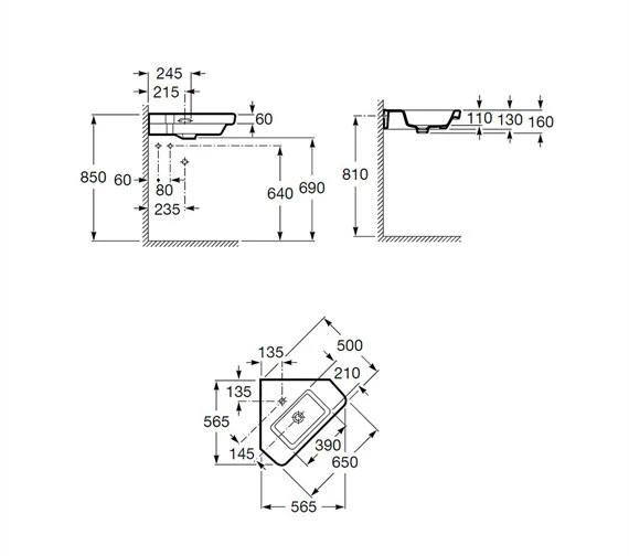 Roca Dama-N Wall Hung White Corner Basin 650mm With Fixing Kit – 32778C000